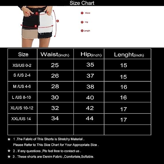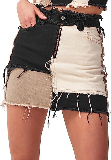 - Feastures & Fashion :Zipper Fly Closure , Mid-Rise ,Color Blocking ,patchwork ,4* Back Pockets ,above knee length ,Distressed Mini Jeans Skirt, Slim Fit .