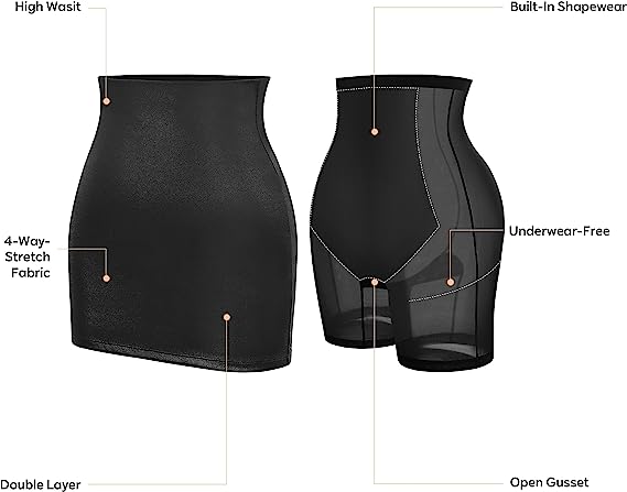 - 【UNIQUE BUILT IN SHAPEWEAR DESIGN】The abdominal double-layer mesh of this tummy control shapewear skirt effectively tightens your abdominal fat, help you smooth the curve of abdomen, the inner shapewear also has butt lifter effect. High elastic fabric make it comfortable enough to wear all day. If you are between 2 sizes, please choose size up for all day comfort. For long-term use, we advise hand washing this Faux Leather Shaper Skirt.