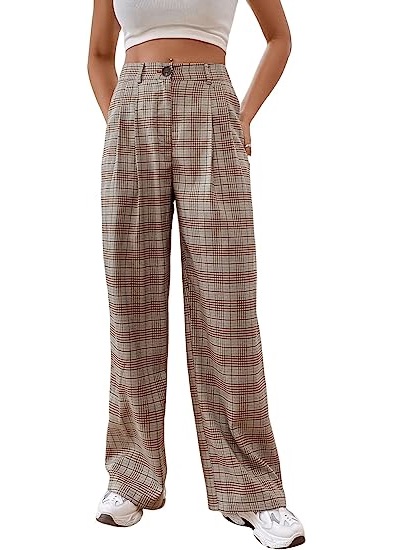 - Features: High waisted, elastic waist, button and zipper front, pleated, plaid print, wide leg, loose fit.